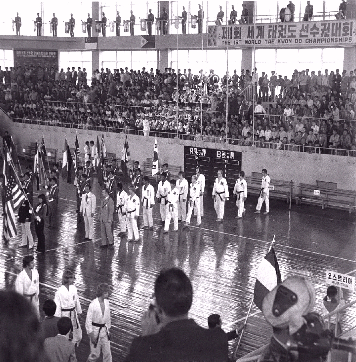 Richard Chun and Ed Sell lead the USA contingent into the Kukkiwon at the First World Taekwondo Championships - Seoul Korea - 1973 (Photo courtesy of G/M Ed Sell)