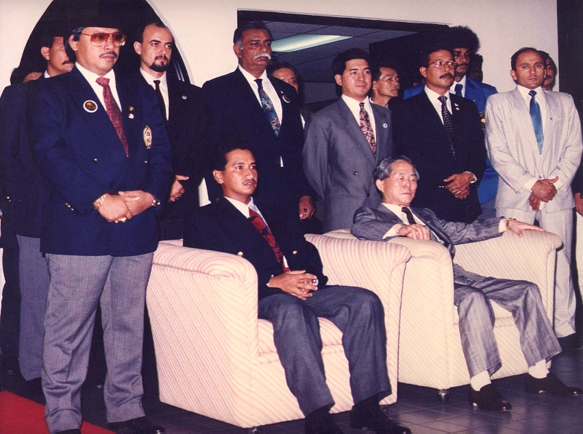 Mounir Ghrawi standing behind Malaysian King Sultan Mizan who is seated with General Choi Hong Hi (Malaysia 1991) Photo courtesy of GM Mounir Ghwari