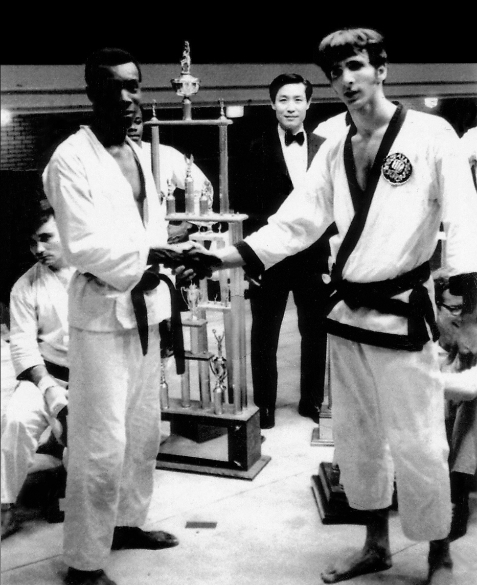 Bob Chaney (kneeling), The "Late Great" Byron Jones, II Joo Kim, and Mitchell Bobrow - Circa 1969 photo by George Anderson / Techhenical Advisor - TKD Hall of Fame