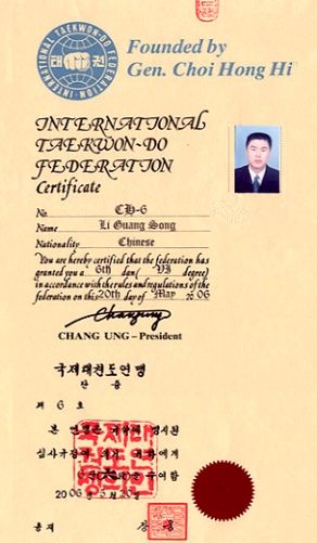 of Taekwon-Do, who instructed Mr. Li Guangsong in the techniques and spirits
