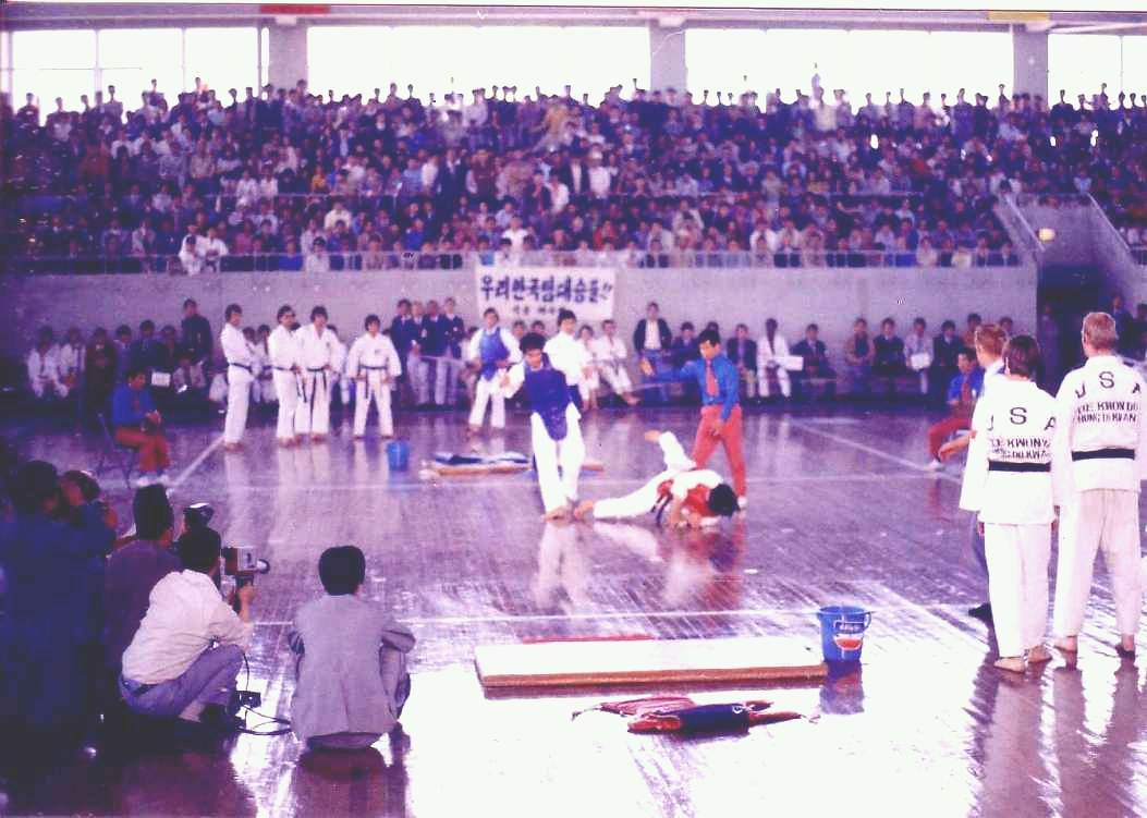 Midwest Team Coach Ed Sell watches as USA downs an opponent in the Kukkiwon at the First World Taekwondo Championships - Seoul Korea - 1973 (Photo by Fred Absher) BACK TO THE TAEKWONDO HALL OF FAME Comments or Suggestions