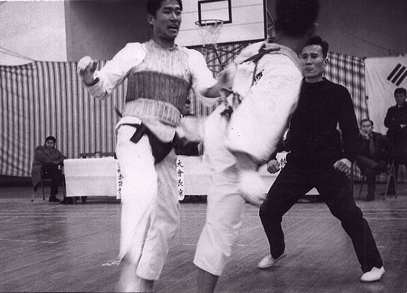 Korean National Champion PARK Yeon Hee (Left) devasted his opponents in the 60's in Korea and Japan. His most feared weapon was his bone crushing front kick. (Photo Courtesy of Kim Soo - Sr. Technical Advisor -Taekwondo Hall of Fame)